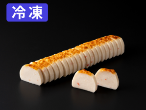 すり身とズワイガニペーストを練り合わせ、焼きを入れて風味と食感を引き立てた冷凍スライス済みのかに風味かまぼこです。焼き工程により香ばしい焼き目がつき、味わい深い仕上がりとなっています。