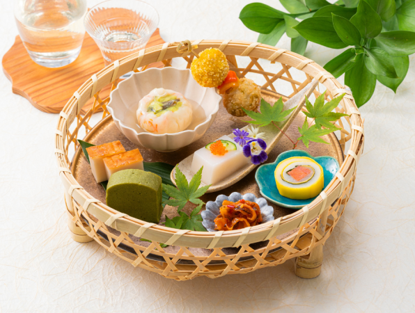山芋とマッシュポテトの生地にメレンゲを合わせ、ふわりとほどける口当たりに仕立てました。わらびと筍を包み込み、早春の趣を感じさせる上品な彩りを添えています。お好みで季節の餡をかけてお召し上がりください。