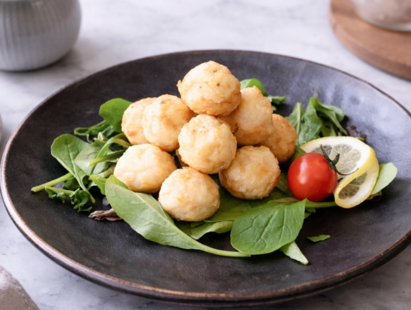 スケソウに鱧すり身を合わせ、歯切れのよい食感に。刻み蓮根でシャキシャキ感を加えた一口サイズのボールに仕上げました。彩りの人参がアクセントとなり、揚げ物にも煮物にも使える万能タイプです。